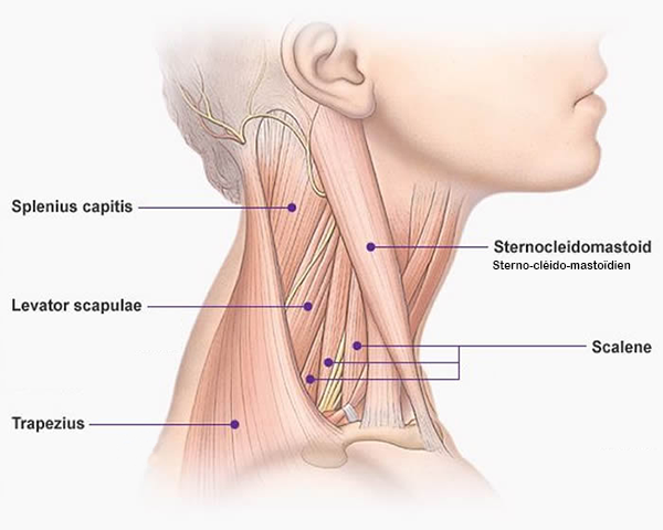 - une forte contraction des muscles du rachis cervical (muscle sterno-cléido-occipito-mastoïdien, muscle trapèze, muscle scalène, les splénius du cou et de la tête, les sous-occipitaux)