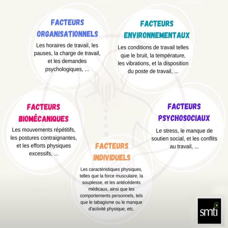 Il existe cinq origines favorisant l’apparition des TMS: biomécaniques, psychosociales, environnementales, organisationnelles et des facteurs individuels.