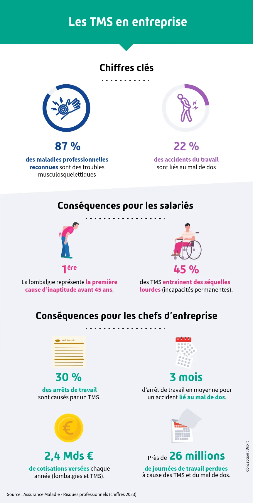 - 46 % des TMS entraînent des séquelles lourdes (incapacité permanente), avec des risques de désinsertion professionnelle.